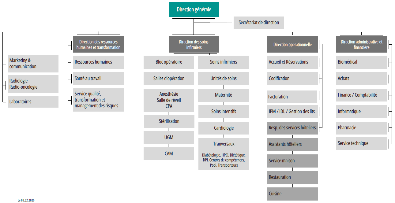 - Service Qualité et Transformation: Ce service est le garant de la démarche qualité. Il assure la coordination des projets qualité, l'animation des groupes de travail, la collecte et l'analyse des données, ainsi que la communication sur les actions menées.